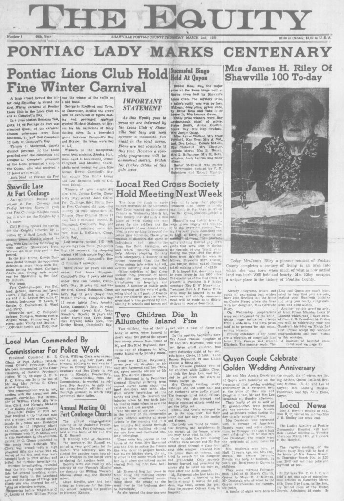 Local News: The first winter carnival of Pontiac Lions Club was held in the Lions Club arena at Campbell’s Bay on Saturday where a large crowd braved the bitter cold to attend. Winners of the single dog sled race: first Jerome Devlin of Campbell’s Bay; second John Davies of Fort Coulonge; third Philip Davies of Fort Coulonge.