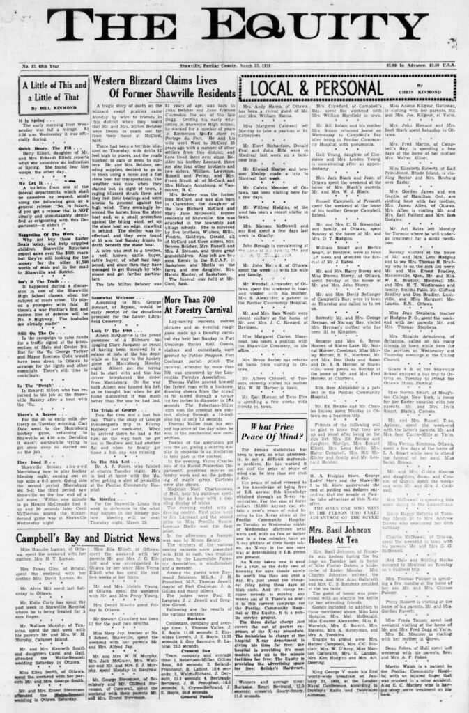 A little of this and that: Isn’t it the truth . . . It happened during a discussion in one of the Shawville High School classes, when the subject of roads arose. Up pipped a youngster with this: “If there’s a war Pontiac’s first and easiest line of defence will be No. 8 Highway. The foxholes are already made!”