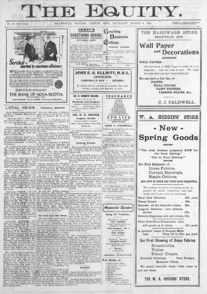 The curling rink is proving a very popular attraction this Winter, not only to the villagers but to quite a number of the country “old-boys” as well, who are fast learning the art of throwing a dangerous iron. Quite a number of contests have been pulled off and not a few surprises have been sprung on some of the seasoned vets, whose skill has been successfully challenged more than once. In the winter sports line Shawville now holds the top place.