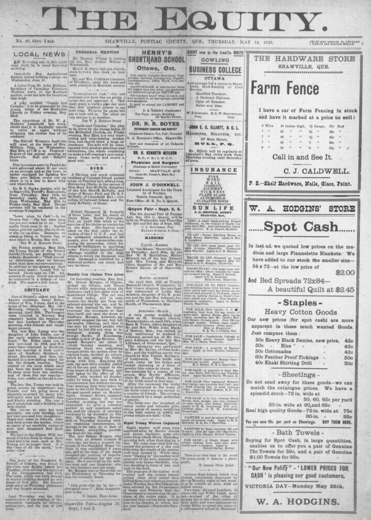On Saturday evening, Mr. Sidney Morgan of Ottawa picked up Gilman and Thorp Brown while motoring along the Gatineau road a few miles west of Kazabazua village. The car was a closed sedan and in some manner the deadly gas from the exhaust entered the car and before they realized it, the fumes overcame the occupants so that they could not open the doors or windows. Morgan, however, apparently stopped the car but left the engine running and thus it was seen by several parties who passed by but did not stop to investigate. Among them was George Marks of Kazabazua, who passed by and thinking there was something strange about the matter after he reached home, returned with Dr. Sulley along with him. The men were quickly pulled out of the car and rushed to the farm house of Archie Wilson and later taken to the office of Dr. Sulley who worked all Sunday night to bring the men back to consciousness but without success.