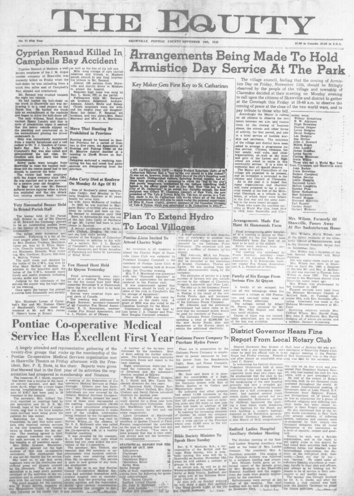 Local News: There is a plan to extend hydro to local villages. Ray Johnston, MLA for Pontiac said the electric distribution system will be extended to the townships of Bristol, Clarendon, Thorne and Leslie. He was quoting from the official announcement made by the company.