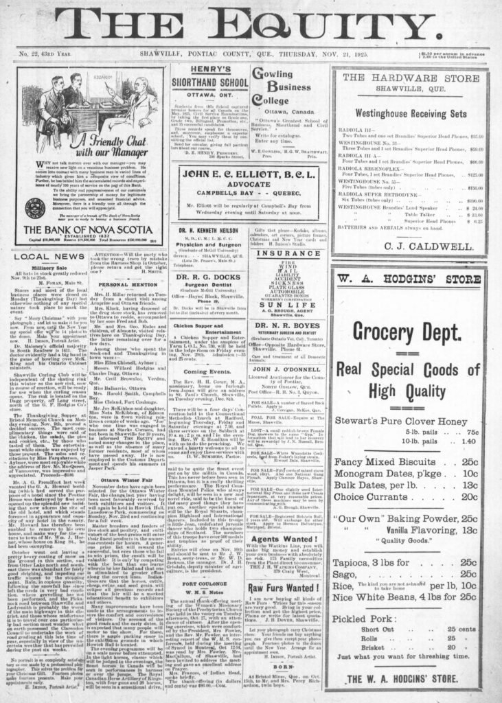 Local news: Shawville Curling Club will be independent of the skating rink this winter, as the new rink, now in course of erection, will be ready for use when the curling season opens. The rink is located on the Dagg property, off Lang Street, north of the G. F. Hodgins Co’s store.