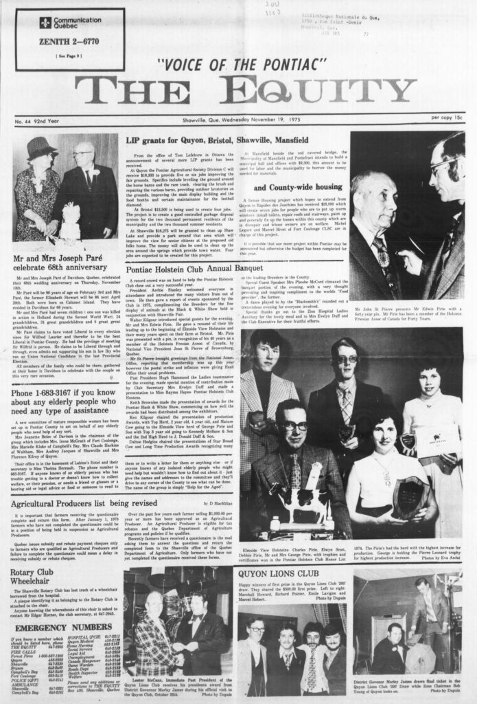LIP grants for Quyon, Bristol, Shawville, Mansfield: From the office of Tom Lefebvre in Ottawa the announcement of several more LIP grants has been received.