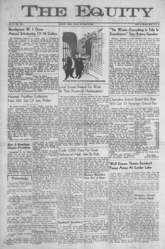 Forty-five families with the name Hodgins in Shawville have telephones but there are none listed in Campbells Bay. Next in strength, numerically, are the Horners, with 23 in Shawville and two in Campbells Bay.