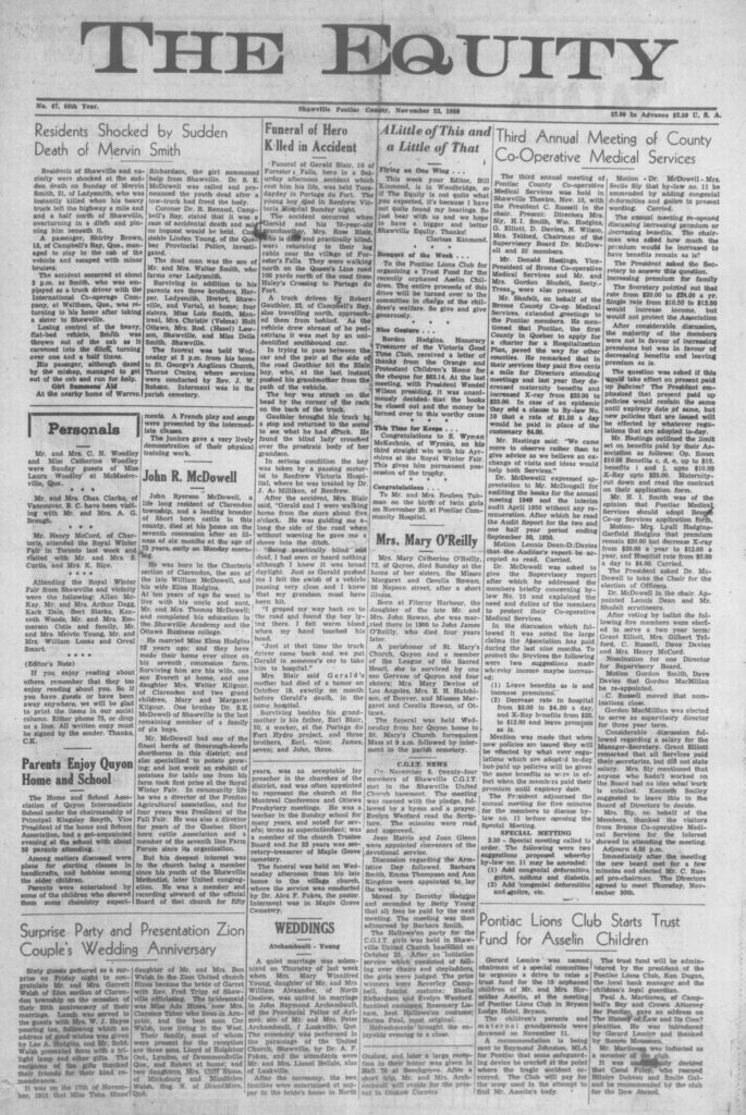 Local news: Attending the Royal Winter Fair from Shawville and vicinity were the following: Allan McKay, Mr. and Mrs. Arthur Dagg, Kark Dale, Bert Starks, Kenneth Woods, Mr. and Mrs. Emmerson Cotie and family, Mr. and Mrs. Melvin Young, Mr. and Mrs. William Lucas and Orval Smart.