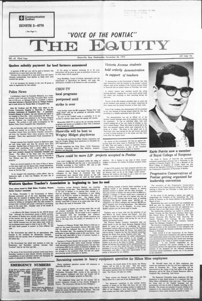 Two juveniles (under 18 years of age) were similarly charged by Constables Dostallier and Chassé. The officer in the Bean case was Constable Tremblay. Also charged on Hallowe’en night in Shawville is Tom Whelan, also 19. This charge is for damaging property.