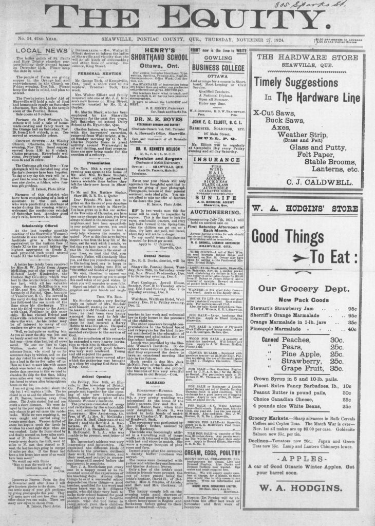 Ad: Dressmaking: Mrs. Walter E. Elliott desires to inform the ladies of Shawville and vicinity that she will do all kinds of dressmaking and other lines of sewing. Residence, King Street.