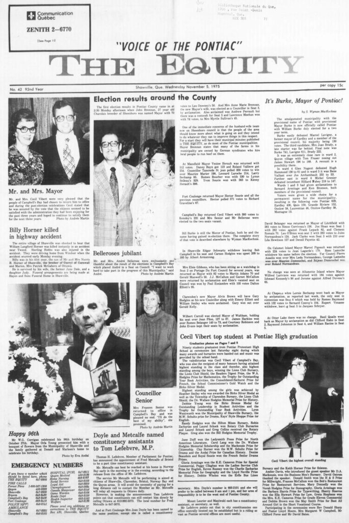 Pontiac County Election Results: The first election results in Pontiac County came in at 2:30 Monday afternoon when John Brennan, 27-year-old Charolais breeder of Sheenboro, was named Mayor with 70 votes to Leo Downey’s 50. And Mrs. Anne Marie Brennan, the new Mayor’s wife, was elected as a Councillor in Seat 3, by acclamation. Also acclaimed was Andrew Perrault, but there was a contest for Seat 5 and Lawrence Meehan won with 74 votes, to Mrs. Myrtle Sullivan’s 45.