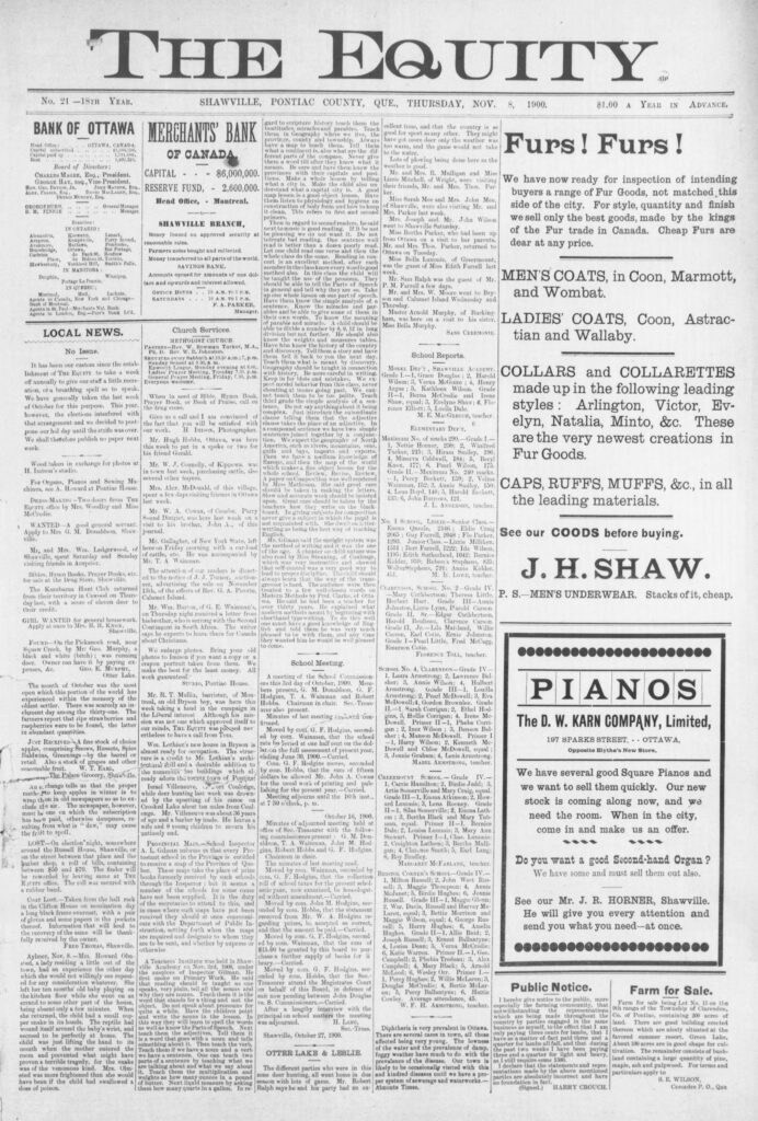 Local news: Wm. Lothian’s new house in Bryson is almost ready for occupation. The structure is a credit to Mr. Lothian’s architectural skill and a desirable addition to the numerous fine buildings which already adorn the county town of Pontiac.