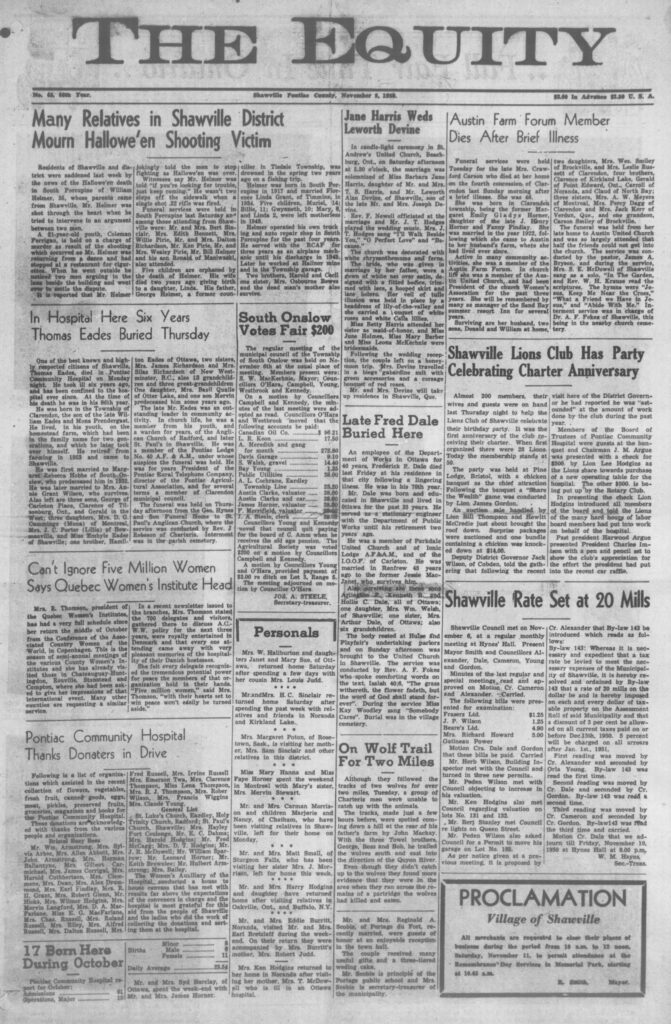 Shawville Rate Set at 20 Mills: Shawville Council met on November 6, at a regular monthly meeting at Hynes’ Hall. Present: Mayor Smith and Councillors Alexander, Dale, Cameron, Young, and Gordon. It is proposed by Cr. Alexander that By-law 143 be introduced, which reads as follows: “Whereas it is necessary and expedient that a tax rate be levied to meet the necessary expenses of the Municipality of Shawville, it is hereby resolved and ordained by By-law 143 that a rate of 20 mills on the dollar be and is hereby imposed on each and every dollar of assessed property within said municipality and that a discount of 3 percent be allowed on all current taxes paid before Dec. 15th, 1950. 5 percent will be charged on all arrears after Jan. 1st, 1951.”