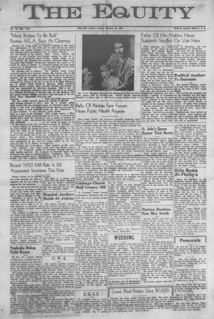 “More Bridges To Be Built” Pontiac M.L.A. Says At Opening: Surveys are being made for the replacement of the Fort Coulonge and Nicoba bridges, Ray Johnston, MLA for Pontiac, said last Sunday at the official opening of the Charles Ivers Bridge linking Allumette Island and Waltham. Mr. Johnston also intimated that further bridges would be built in Pontiac including one at Breckenridge and one at Bernard Creek.