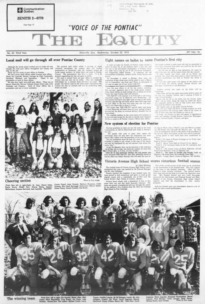 Thus far in that particular election, the only people who have informed THE EQUITY that they definitely intend to run for office are James Stewart who will seek the seat for the Quyon Ward, that is Ward 2, and also Marcel Lavigne and Bill Burke who will seek the Mayor’s seat. By next week all nominations will be in the hands of the president of the election, Mary Ann Glazer, at the town hall in Luskville.
