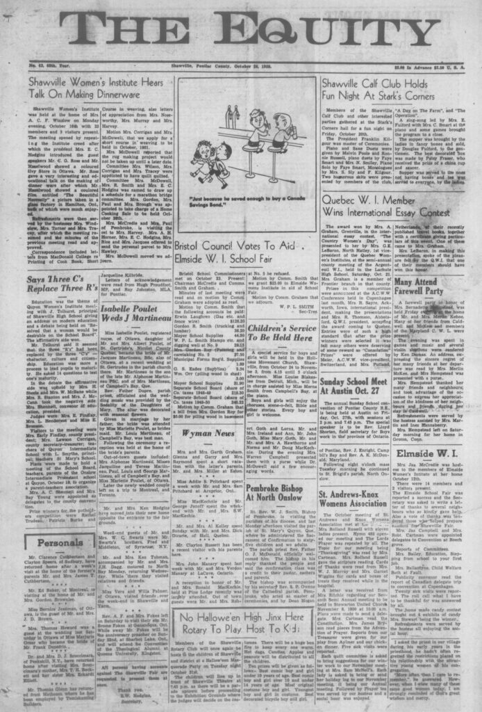 Ad: House — Main Street, built in 1947. Cost $12,600. Furnished it cost $14,000. All conveniences and oil heated. Sell house and lot for $9,600 cash. Furniture and garage also for sale. Ken Smyth, phone Shawville 128.