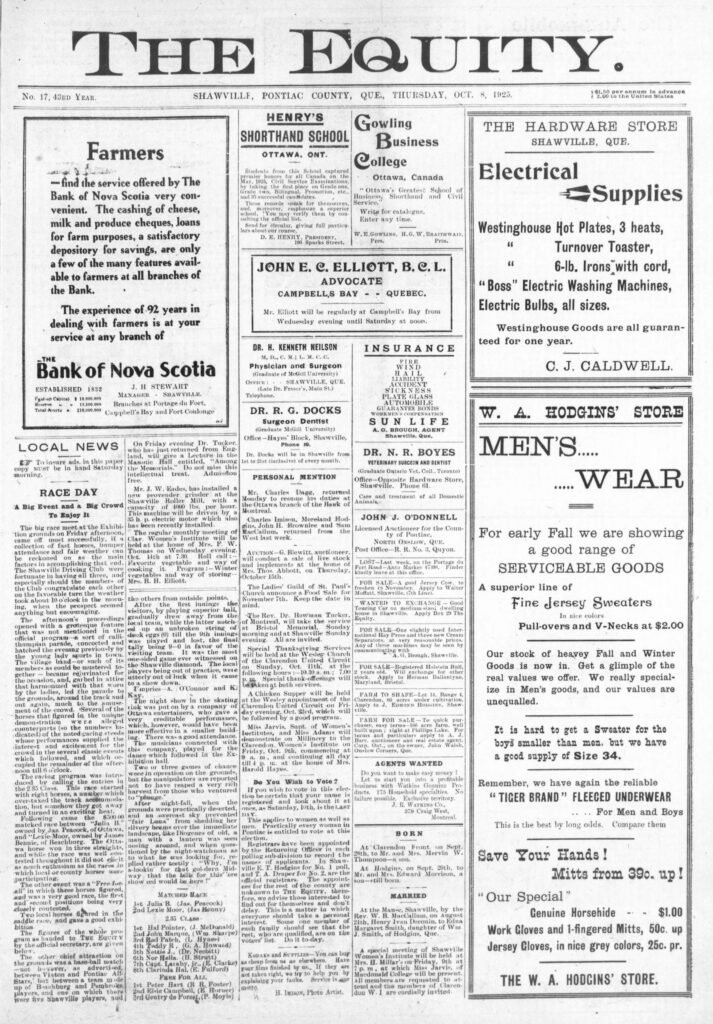 Local news: The big race meet at the Exhibition grounds on Friday afternoon, came off most successfully, if a collection of fast horses, bumper attendance and fair weather can be reckoned on as the main factors in accomplishing that end. The Shawville Driving Club were fortunate in having all three, and especially should the members of the Club congratulate each other on the favorable turn the weather took about 10 o’clock in the morning, when the prospect seemed anything but encouraging.