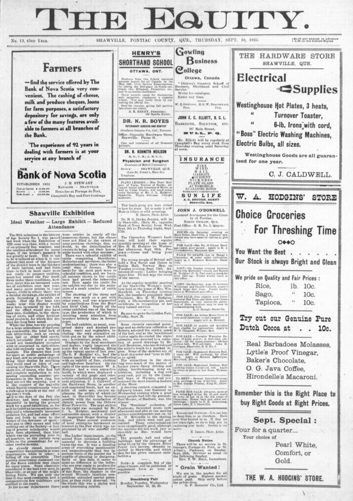 Local News: The 69th milestone in the history of Agr Society No. 1. was passed last week when the Exhibition of 1925 came to a close, with a record of exceptionally fine weather, and the smallest attendance for many years, if the writer’s memory is not greatly at fault. This is not to be wondered at when it is considered that most of the district were in the thickest of their harvest, and had little time— in fact in most cases were not ready — to prepare exhibits, much less attend the Fair itself. Even under these conditions, however, there was an increased number of exhibitors over last year, and many more entries in some classes, while in others there was a decided shrinkage, the exhibit of grain furnishing a notable example. Had the Fair been two weeks later this display would have been increased by ten-fold, and the effect would also have been seen, doubtless, in the showing of roots, and other horticultural products, for which this district has long been noted.