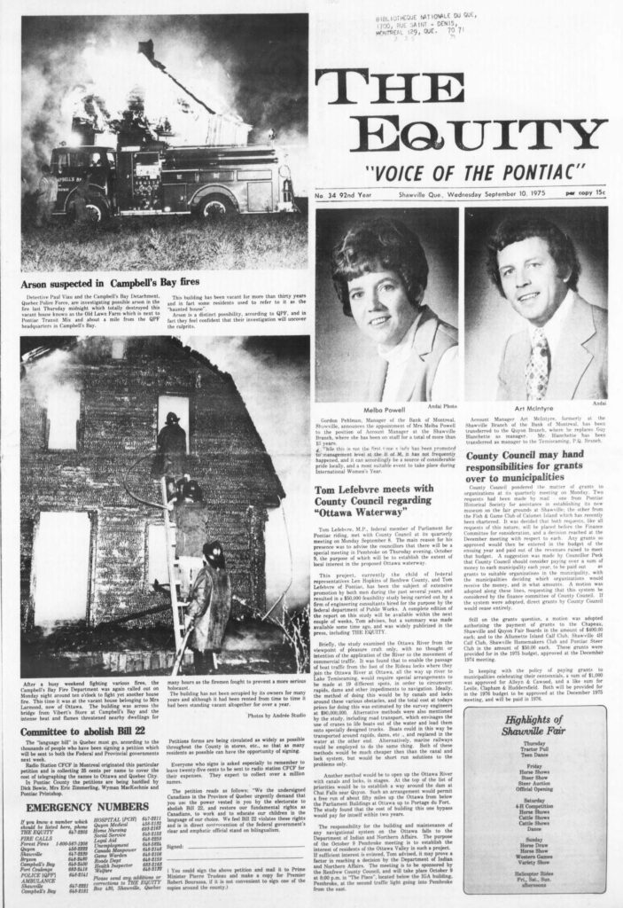 Committee to abolish Bill 22: The “language bill” in Quebec must go, according to the thousands of people who have been signing a petition which will be sent to both the Federal and Provincial governments next week. Radio Station CFCF in Montreal originated this particular petition and is collecting 25 cents per name to cover the cost of telegraphing the names to Ottawa and Quebec City. In Pontiac County the petitions are being handled by Dick Bowie, Mrs Eric Zimmerling, Wyman MacKechnie and Pontiac Printshop. The petition reads as follows: “We the undersigned Canadians in the Province of Quebec urgently demand that you use the power vested in you by the electorate to abolish Bill 22, and restore our fundamental rights as Canadians, to work and to educate our children in the language of our choice. We feel Bill 22 violates these rights and is in direct contravention of the federal government’s clear and emphatic official stand on bilingualism.”