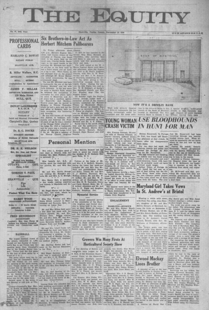 Local News: The largest baseball crowd of the season, estimated at 1,200, turned out last Sunday at Campbell’s Bay to see Vinton take the opening game from Campbell’s Bay in the Pontiac Senior League. Vinton took the first game in the best of three series by a score of 3 to 1. The game, which went ten innings, was all Campbell’s Bay’s who led Vinton by 1-0 until the opening of the ninth inning, when Vinton scored a run and followed this in the top of the 10th inning with two more. The Campbell’s Bay run was by Martin on Bowie’s hit. Donnelly scored two for Vinton and O’Brien one for the same team.