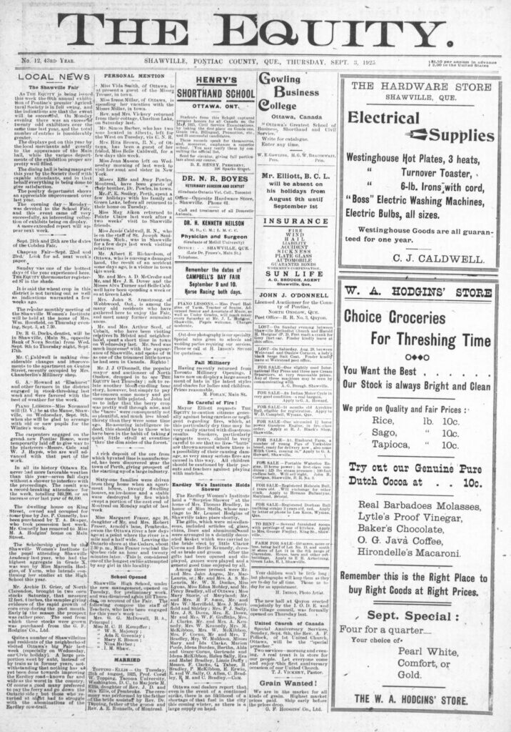 As THE EQUITY is being issued this week, the 69th annual exhibition of Pontiac’s premier agricultural society is in full swing and the indications are that the event will be successful. The displays put on this year by the local merchants add greatly to the appearance of the main hall, while the various departments of the exhibition proper are pretty well filled.