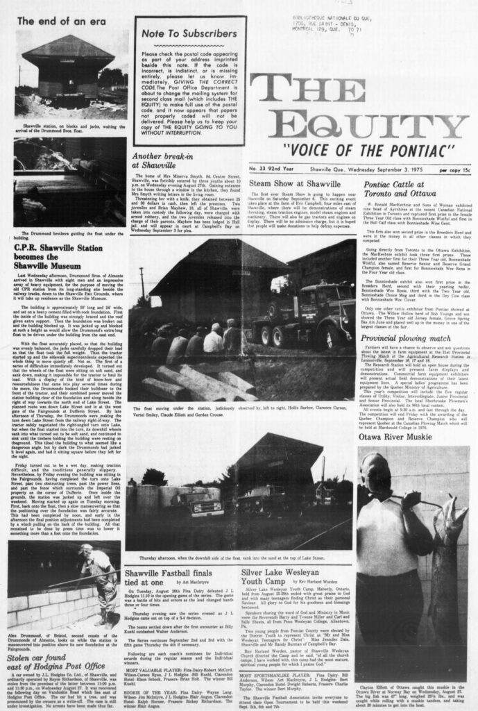 C.P.R. Shawville Station becomes the Shawville Museum: Last Wednesday afternoon, Drummond Bros. of Almonte arrived in Shawville with eight men and an impressive array of heavy equipment for the purpose of moving the old CPR station from its long-standing site beside the railway tracks, down to the Shawville Fair Grounds, where it will take up residence as the Shawville Museum.