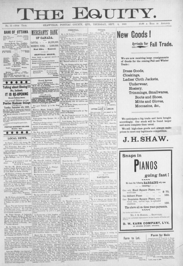 Labor day — Monday— was observed in the literal sense of the term in Shawville. Save the bank, every other place of business was open, and the regular routine of trade and barter was rigidly adhered to. Had it been otherwise the number of farmers who came into town on that day would have been disappointed.