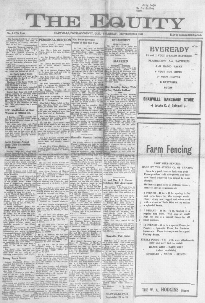 Local News: On Labour Day Monday, about 4,000 persons jammed into the village of Bryson for the first annual Lions Club Labour Day celebrations. A spectacular 80-foot dive by an Ottawa swimmer and a draw for a new car and other prizes were highlights of the event which produced what police called the “greatest tie-up of traffic we’ve ever seen in Pontiac.”