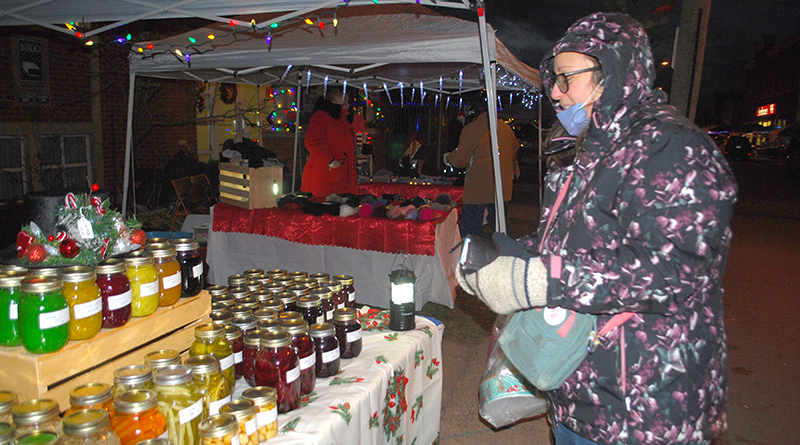 Vendors lined Main Street in Shawville to sell their goods on a chilly Dec. 3 evening market. People meandered through the booths and kiosks as Christmas music played in the background, creating a pleasant shopping ambiance despite the cold. Pictured is Mishka Kucharik shopping for homemade beets available from Donna Rebertz’s cache of pickles, preserves, jams and jellies.