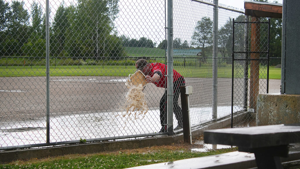 Once the storm settled, players were determined to get a full game in before nightfall. The only challenge? The field was swamped, so they got to work emptying the diamond of rainwater.