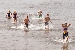 After a late night of dancing, the 9 a.m. start for the triathlon seemed to take its toll on some of the event’s competitors. But once they changed into their swimming gear and got down on the docks, the cold air served as a stern wakeup.
