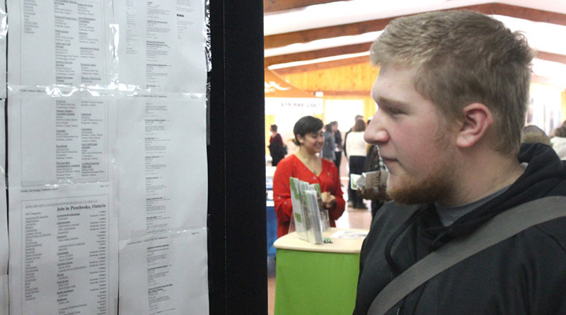 Pictured, Jacob Desgagne looks at a billboard featuring around 90 job postings.