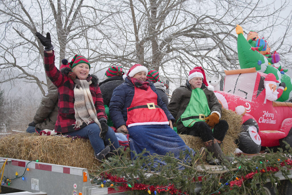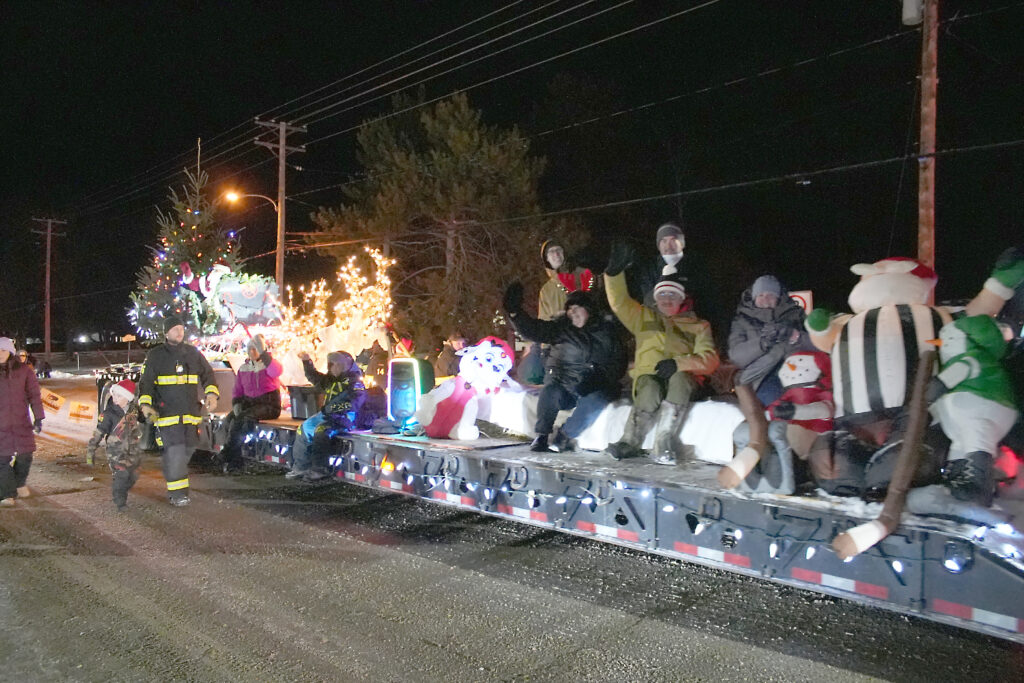 From left, Lisa Peck, Bentley Chamberlain , Kyrie Chamberlain and Olivia Woermke cruised through Danford Lake on the Peck’s Wood Services float in the town’s Santa Claus parade on Saturday morning. Photo: K.C. Jordan
