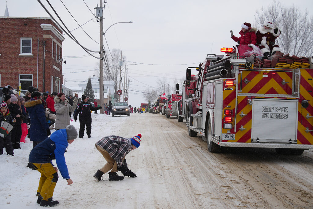 Santa and Mrs. Claus wave to the public from atop a fire truck as they make their way up rue Saint-Jacques in Chapeau on Sunday. Photo: Caleb Nickerson