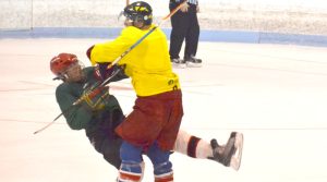 The Pontiac Senior Comets held their tryouts over the weekend at the arena in Fort Coulonge. Their home opener will be on Oct. 13 at 8 p.m. Pictured, things get a little topsy-turvy around the blue line.