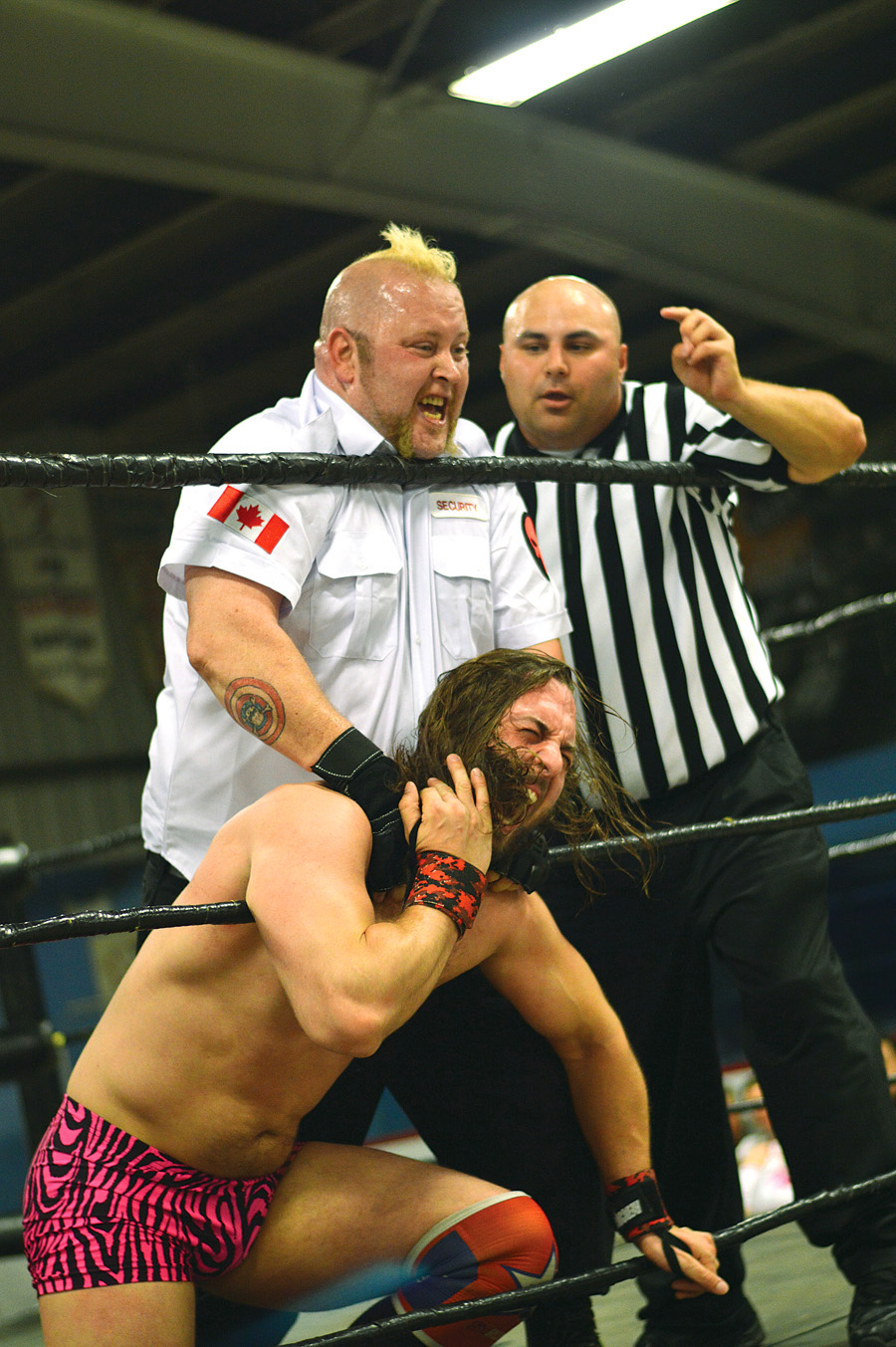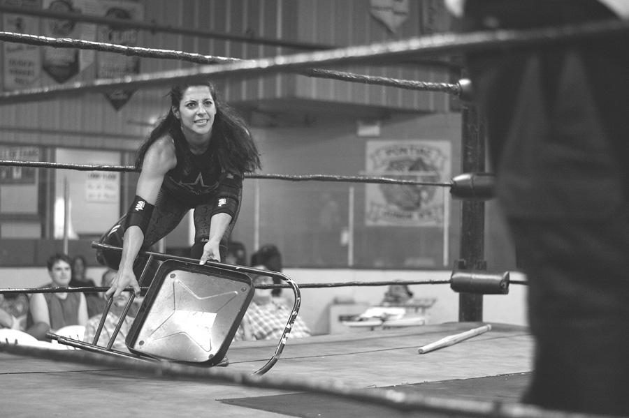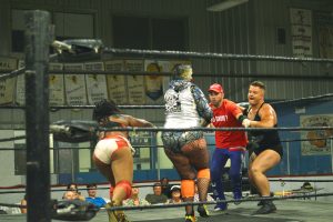 Men in tights held others in chokeholds while shouts of “Use the chair!” rang out from the crowd on Saturday night, as old school, high energy wrestling matches took over the Shawville Arena.