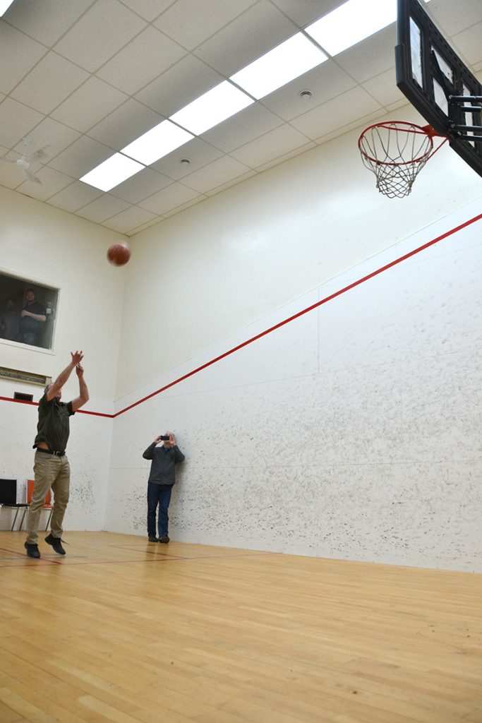 Following a no-show by would-be challenger Andrew Rowat, local basketball phenom Rick Younge was forced to make some ceremonial free throws by himself at the hoop set up on the squash court. The ball was auctioned off for $105 to Kyle Harris, to go towards prizes for the 2019/20 season.