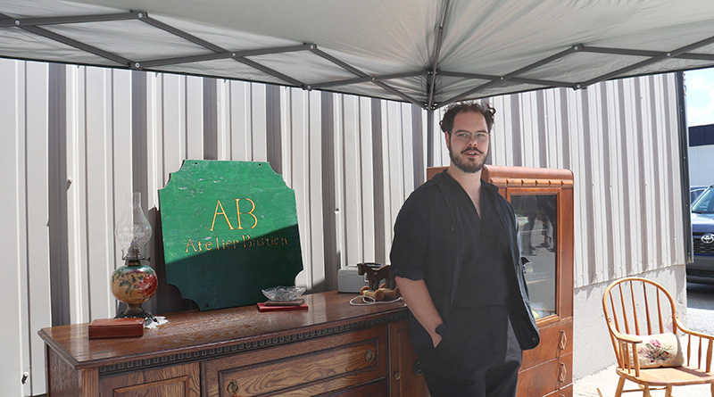 William Bastien standing by his mostly sold-out furniture