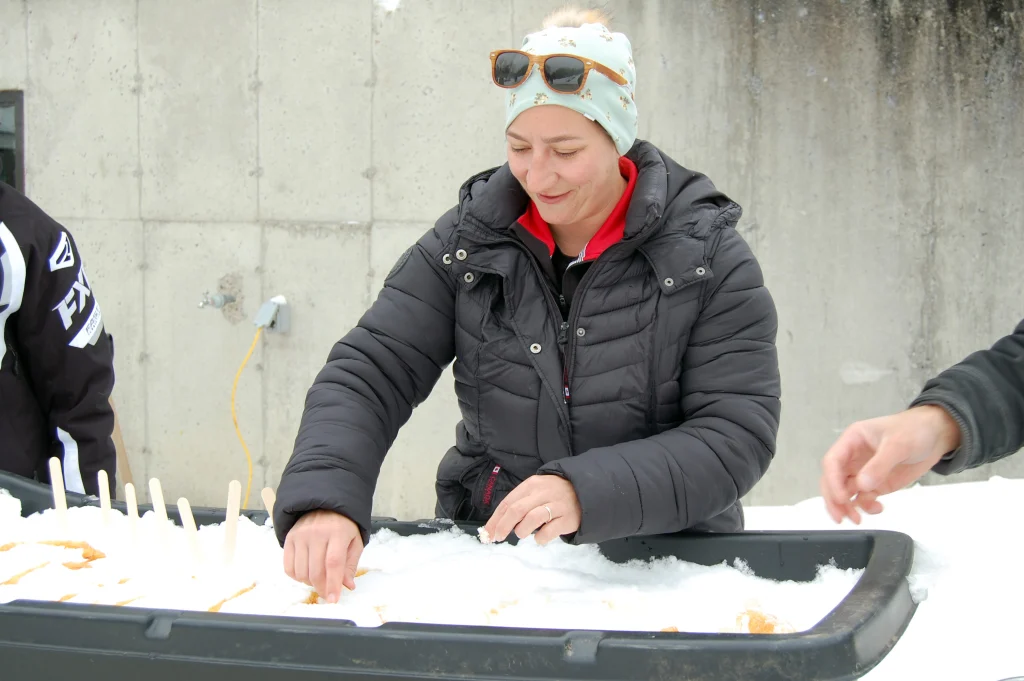 Throughout the morning, maple syrup had been heating up to be served after a free lunch of hot dogs and chilli. A sled was packed full of fresh snow ready to be covered in steaming syrup which would then be rolled up around popsicle sticks.