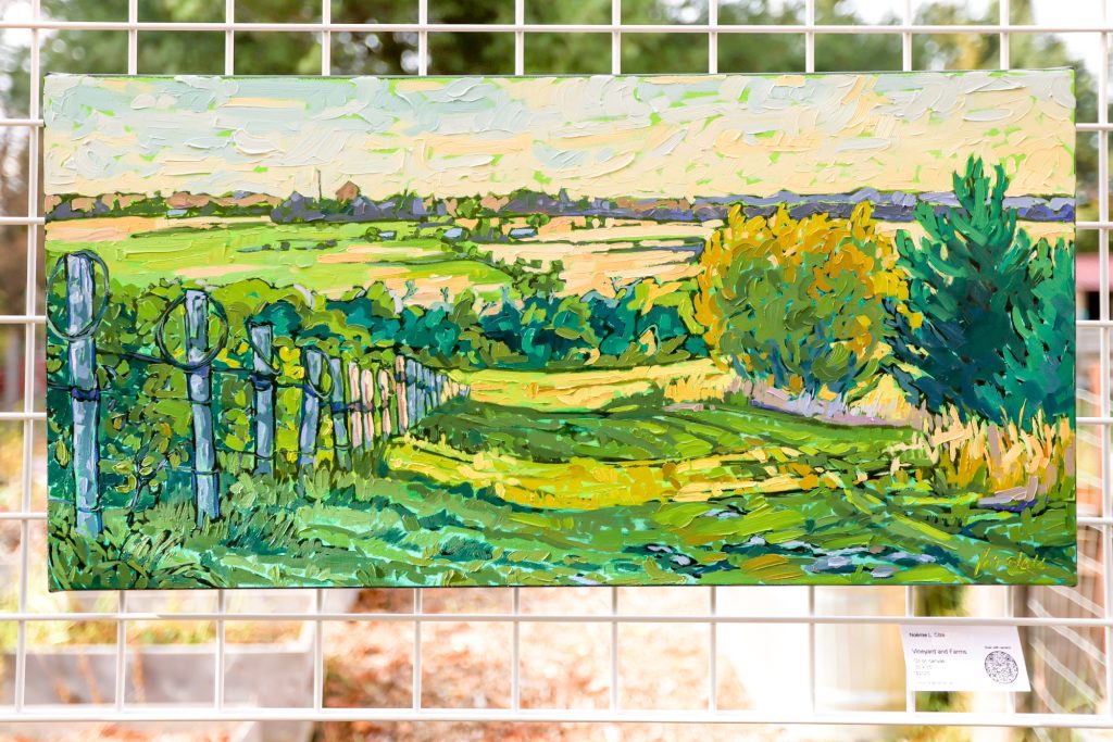The output of her year in residency sees paintings of a variety of vineyards across Canada, focusing primarily on Leystone Farms, KIN Vineyard in Carp, Ontario, and several locations in Kelowna, British Columbia. “We have manmade vines that we choose to nurture, set amongst mother nature – we have trees, mountains, lakes, flowers – and these are the two elements I have chosen visually for this collection.”