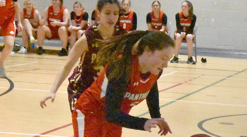 Justine Tanguay running the ball down court as she is being pursued by a player from Nicolas-Gatineau. The Panthers won both games.