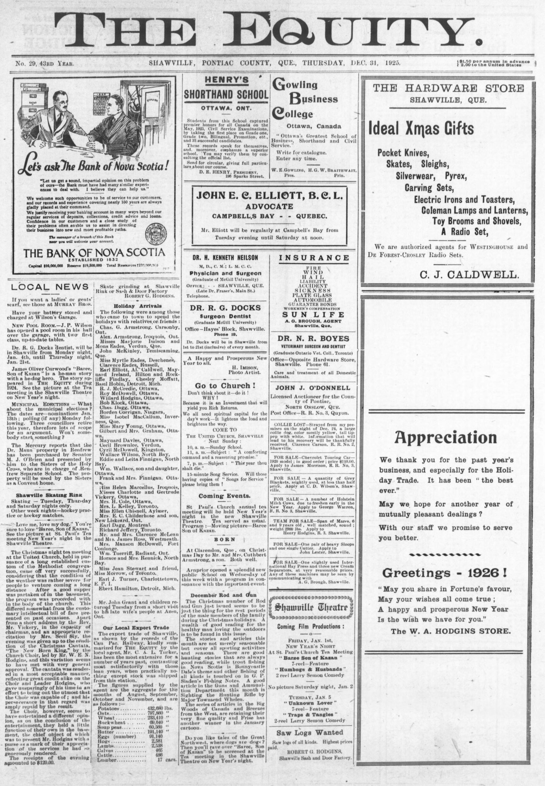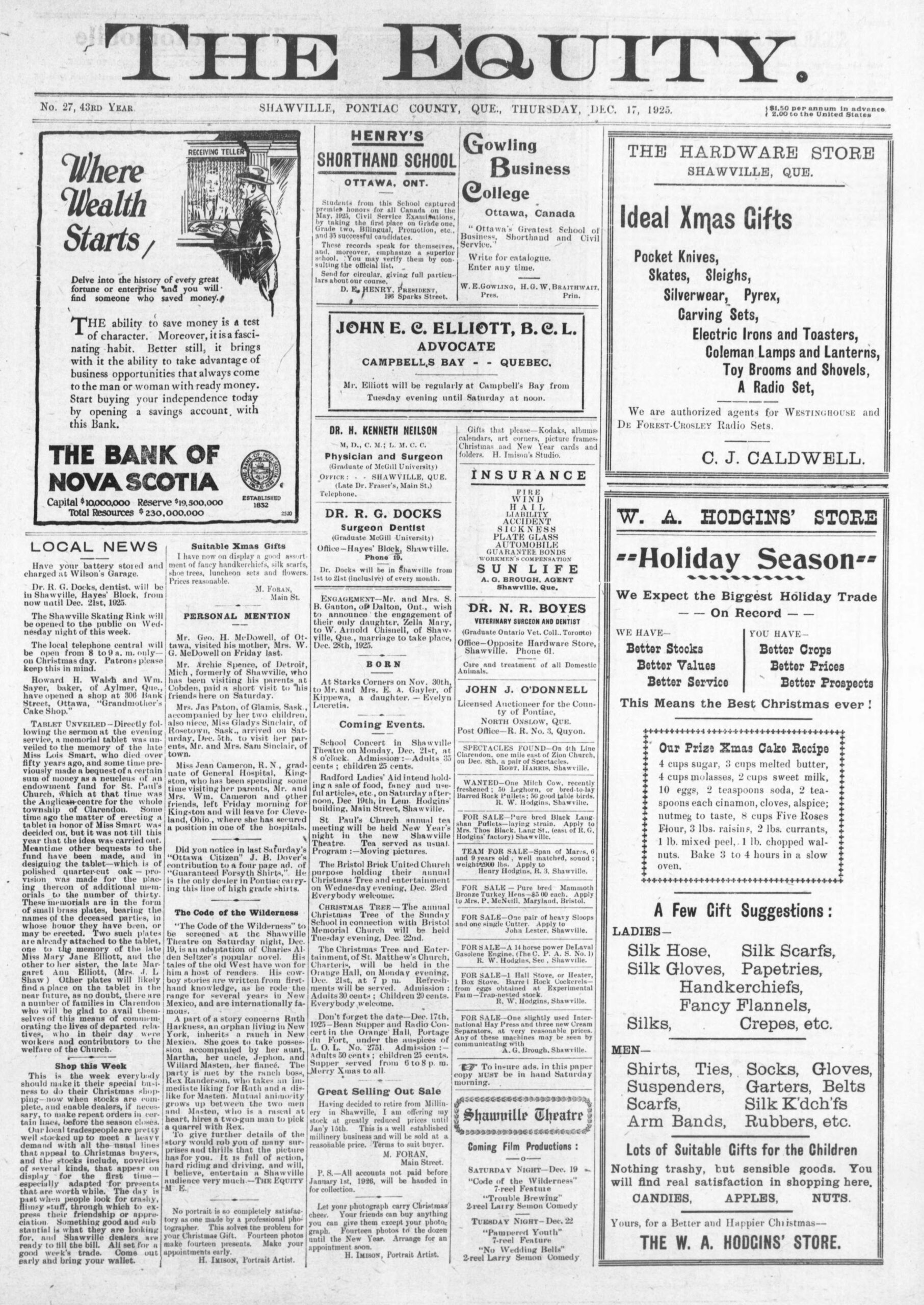Local news: The Campbell’s Bay hockey club have combined with the Boys’ Club to build an open-air rink for this winter amusement. Pity that some of the local well-to-do citizens, with substantial balances in the banks do not bestir themselves,