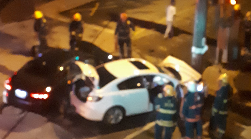 At around 11:30 p.m., a white Mazda carrying two people ran the red light at rue Centre and rue Main, striking a dark Ford carrying a single occupant before hitting a utility pole head-on.