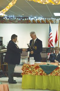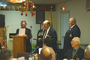 Three lifetime members were recognized at the meal, with Richard Bowie taking home the branch Service Award Medal Legion Bar for his 70 years of service. George Lamothe was presented with a pin for his 30 years of service and Allan Hill was announced to be receiving the same honour, though he could not join the group that evening.
