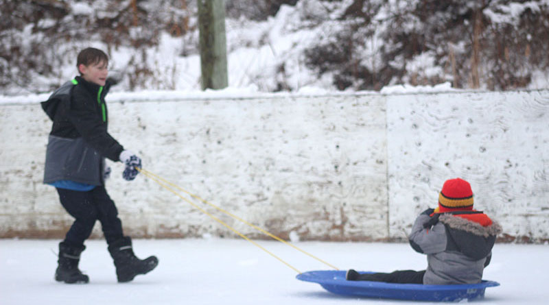 Chase Carrière gives Felix Boucher a good slide on his toboggan on the outdoor rink’s slushy surface during the annual Campbell’s Bay annual Winter Carnival.