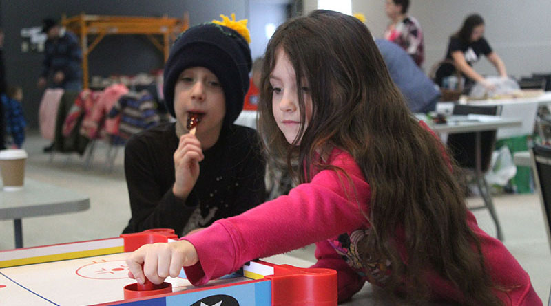 Pictured, Rafael Gariépy watches as Emma Julien goes all out on the air hockey table.