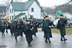 Starting from Branch 231’s hall, the Highland Mist Pipe Band led the parade to the monument, where “O Canada” was sung by Wendy Desabrais and a prayer was recited by Deacon Bob Farmer.