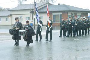 Remembrance Day ceremonies took place Sunday afternoon in Quyon, where those paying their respects braved heavy rain to place wreaths at the town’s cenotaph. The Highland Mist Pipe Band led the parade of soldiers from the Legion hall to the cenotaph.