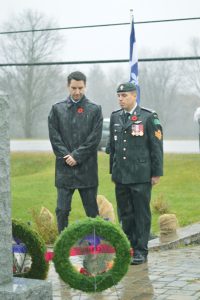 Pontiac MNA André Fortin pauses alongside Sgt. Phil Desormeau, after the former laid a wreath at the monument during the Remembrance Day ceremonies held in Quyon on Nov. 5.