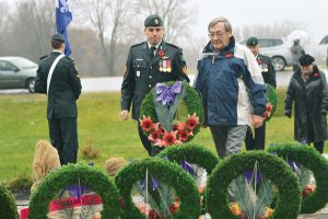 From left: Sgt. Phil Desormeau escorts Roger Dubois as he places a wreath on behalf of the Quyon Lions.