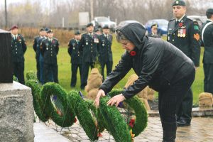 Remembrance Day ceremonies took place Sunday afternoon in Quyon, where those paying their respects braved heavy rain to place wreaths at the town’s cenotaph. Mary Brouse lays the Silver Cross Mother wreath at the base of the cenotaph. Hers was the first to be placed that day, meant to honour all mothers who have lost children in service to their country.