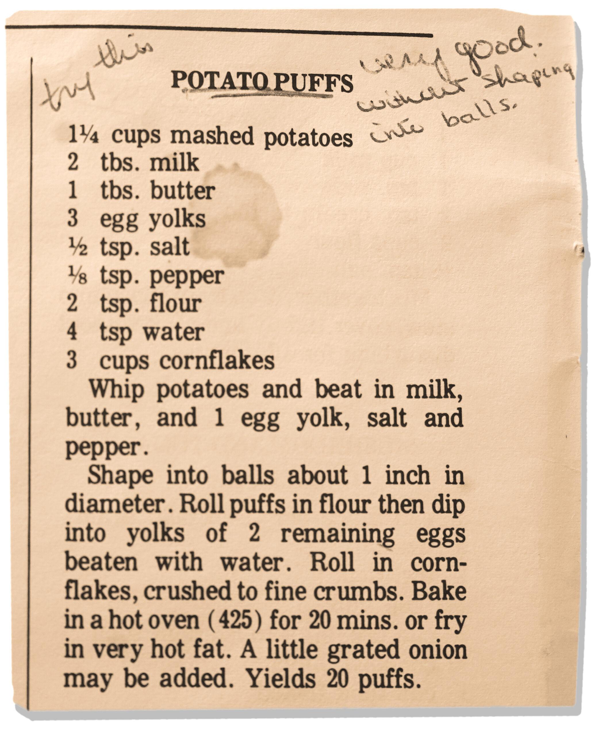 This week’s selection is potato puffs, which the cookbook’s previous owner has assured us is “very good”, even without forming the puffs into balls, apparently. You can bake them, fry them in grease, or even toss them in the air fryer if you’re feeling fancy.