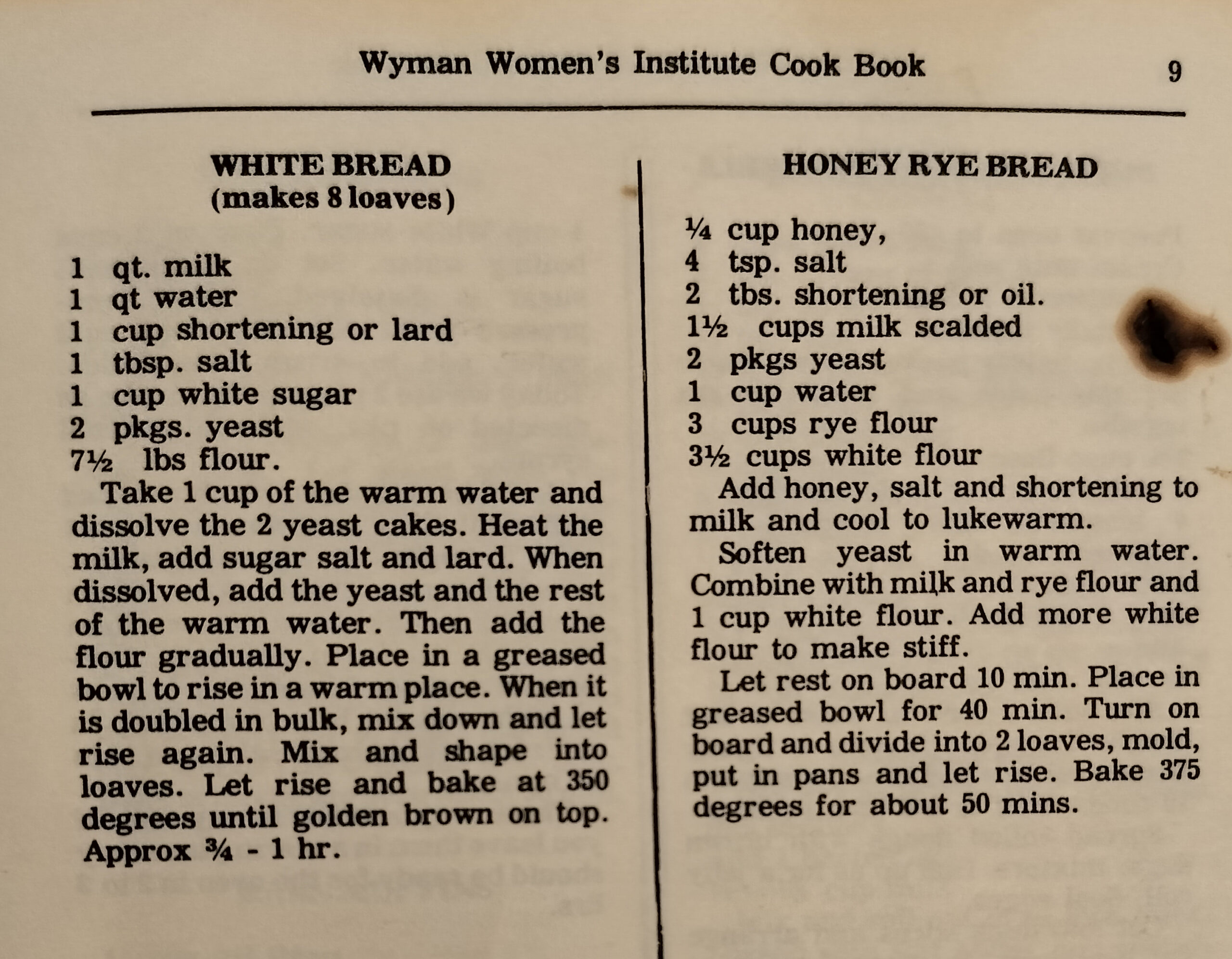 Wyman Women’s Institute Cook Book – White Bread and Honey Rye Bread